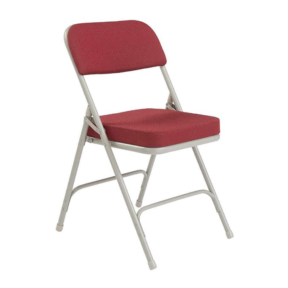 This folding chair is the epitome of comfort, convenience, and style for any setting! The 3200 Series has brought the potential comfort of folding chair to a whole new level with a super-soft 2 inch thick cushion. Features include an institutional-grade fabric upholstered box seat on a masonite board. The large contoured padded backrests are fully covered in matching vinyl or Scotchgarded fabric on both sides. The institutional-grade frame is made from heavy-duty powder-coated 18-gauge round tubing with two U-shaped double-riveted cross-braces - one in front and one in the back - to securely support the double-hinged legs. Color-coordinated V-tip stability plugs provide added reinforcement at the frame's junction and matching replaceable glides prevent floor damage. The 3200 Series meets MAS Certified Green and ANSI/BIFMA standards.