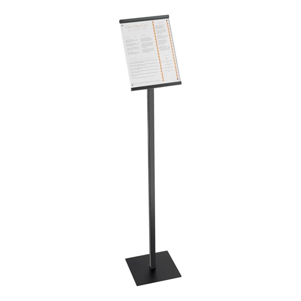 Elevate your signage presentation with this One by One Sign Stand. Standing 46 inches tall, this sleek black metal display features a magnetic front for quick and secure signage changes, making it perfect for menus, promotions, or event details. Designed to hold standard 8.5" x 11" inserts, its modern finish and sturdy square base ensure stability and style in any restaurant, hotel, or retail setting. Durable and easy to use, this freestanding sign holder is the ideal solution for professional, eye-catching displays.