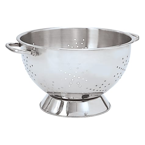 This colander from Darling is made from durable stainless steel and has a mirror finish. It is extra deep with a wide base and has tubular handles. This colander can hold up to 3 quarts and is 9" in diameter. Perfect for professional kitchens.
