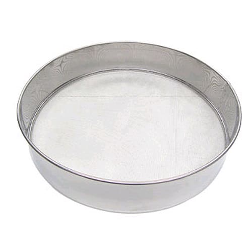 This sieve from Admiral Craft has a stainless steel rim with 20 mesh stainless steel screen mesh. This sieve is 14 in diameter