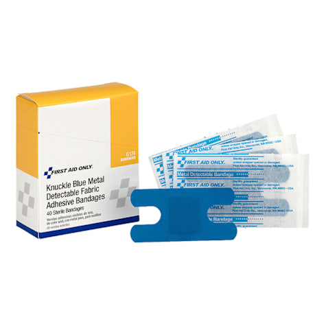 These blue metallic knuckle bandages have a fine woven adhesive comfortably protects minor injuries. These bandages are ideal in restaurant kitchens for easy detection if dropped into food. The metallic strip functions as a detector in the food processing setting.