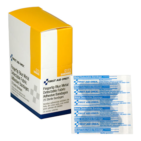 These extra large blue metallic fingertip bandages function as a detector in the food processing setting. They are ideal in restaurant kitchens for easy detection if dropped into food. The fine woven adhesive comfortably protects minor injuries.