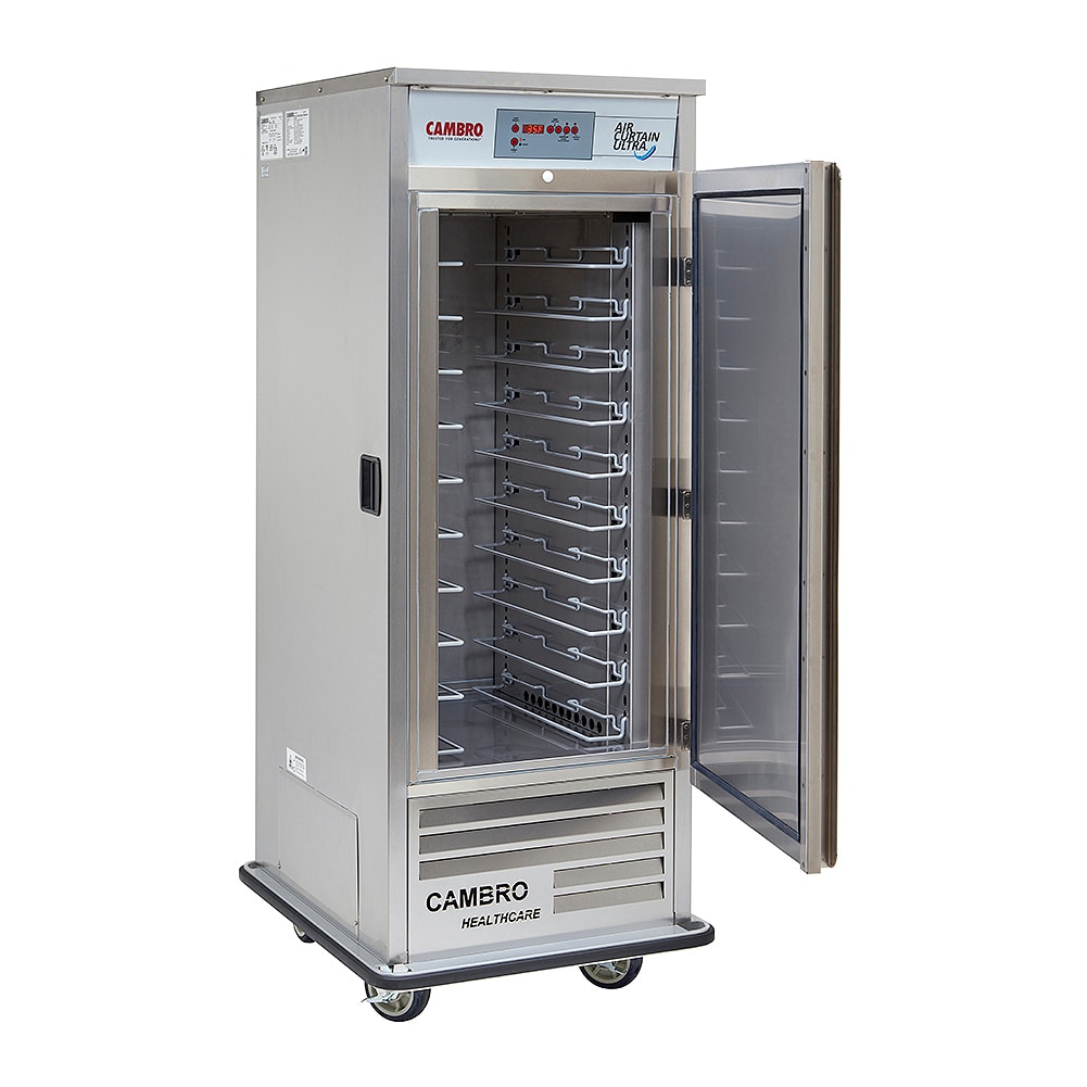This right swing Cambro Air Curtain Ultra maintains temperatures at 41°F or below for up to 2 hours with the door open. Great for healthcare facilities, banquets or room service. The tray slides are removable for easy cleaning.