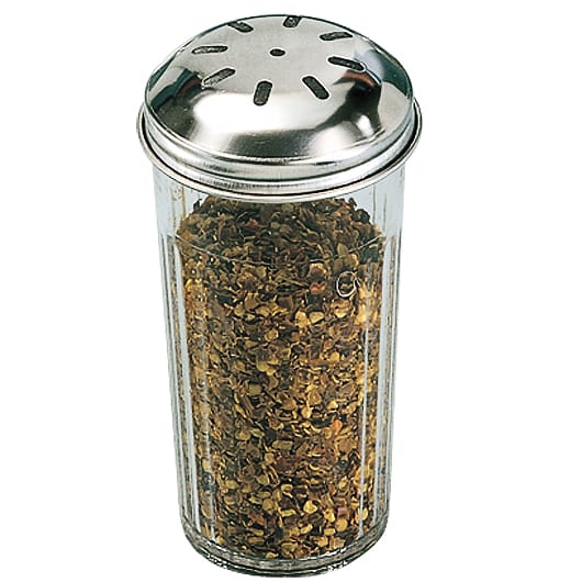 This American Metalcraft 12 oz. spice shaker has a slotted top. The base is SAN plastic with a stainless steel top and is dishwasher safe.