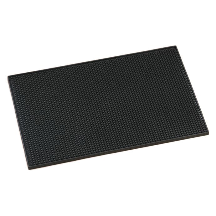 This rubber bar mat features 1‐piece construction and measures 12" x 18". It's a great tool to have behind the bar for draining glasses.