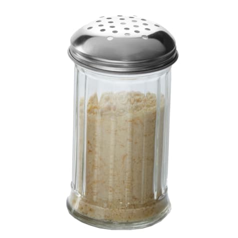 You can't serve Italian dishes or pizza without cheese, so serve it in this glass cheese shaker from American Metalcraft. Comes complete with a stainless steel lid.