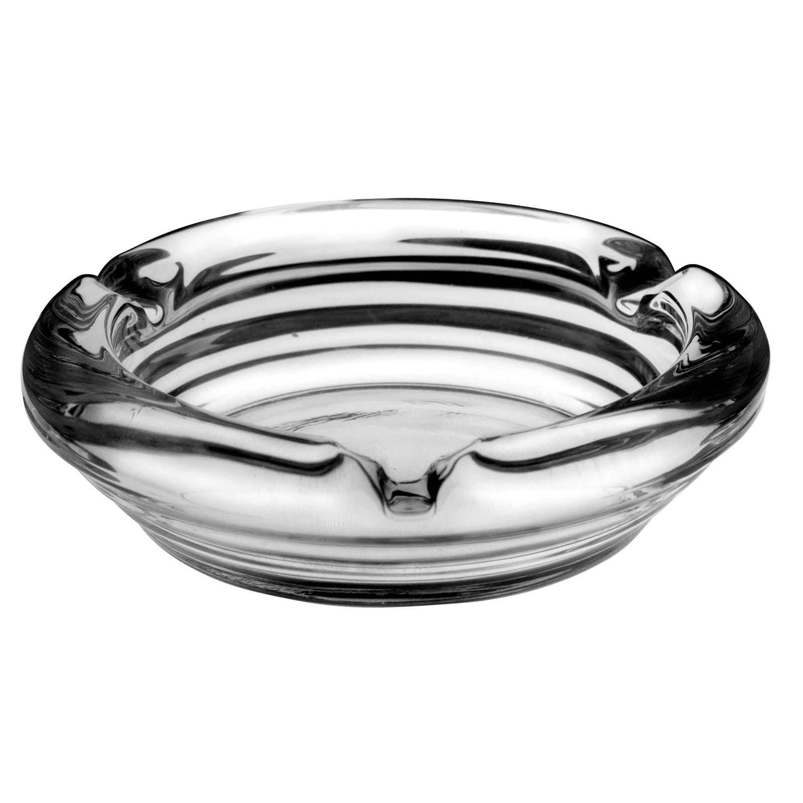 This round 4 glass snuffer ashtray has three grooves around the rim for holding cigarettes.