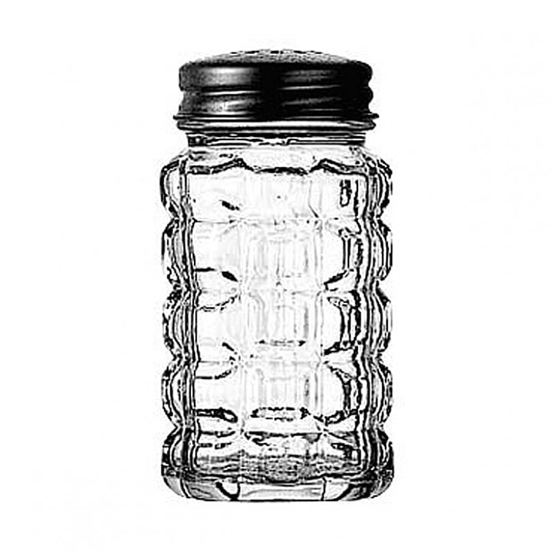 This 2 ounce salt & pepper shaker has a square base and a crystal‐patterned body that resembles old‐fashioned window glass.
