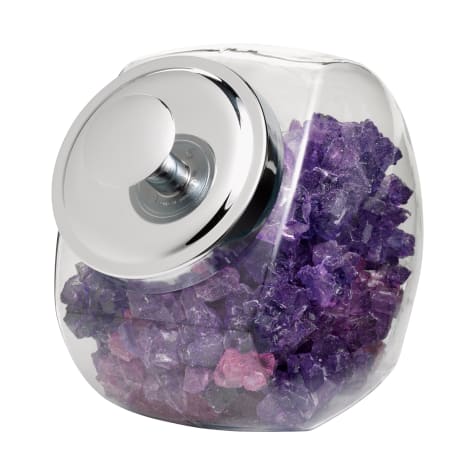 This large, round half-gallon penny candy jar is just like the kind you'd find in an old-time general store or candy shop. It comes with a matching chrome lid.