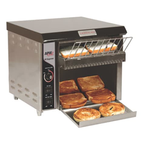 The AT Express small footprint toaster is standard with front loading, variable speed control, super feeder and 1.5" high product opening. It has a 10" conveyor belt and produces over 300 slices per hour. The stainless steel construction protects against kitchen wear & tear and rust with it's metal sheathed heating element it offers enhanced durability and consumer safety vs. quartz tube heating elements. The At Express has high temperature insulated wire for long life and the high temperature bearings never require lubrication. AT Express air circulation system keeps cooling air circulating in toaster even after the power switch is turned off protecting components and exteriors from excessive residual heat.