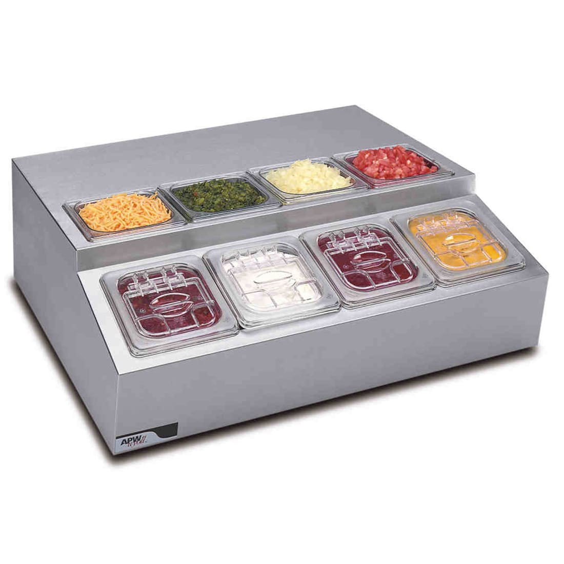 The RTR‐8 refrigerated countertop system that keeps everything at NSF safe temperatures. The RTR‐8 holds 4 pans 1/6th size, 4" deep pans in lower section and 4 pans 1/6th size by 6" deep in upper section. Each pans has its own hinged, removable polycarbonate cover. The RTR Model is great for salad bars or condiment stations. The cold wall refrigeration system utilizes a 1/5 HP compressor.