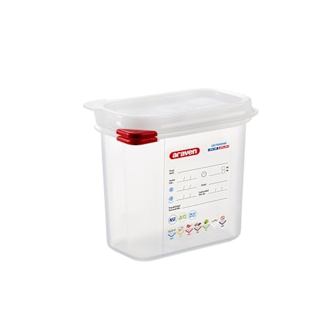 This 1/9 size GastroNorm airtight food storage box from Araven has a capacity of 1.6 quarts and is perfect for a variety of food. The double airtight seal will keep food fresh longer while helping to avoid cross contamination. The transparent color makes it easy to identify the contents and is a great choice for use in restaurants. The integrated label allows related information to be recorded for the contents of the container (expiration date, prep date, etc.) The lid has a convenient tab for easy opening. The color coded ColorClip identification is great for organizing while helping to avoid cross contamination. The rounded corners keep food and debris from accumulating, making cleaning easier! It is dishwasher safe and is safe for temperatures from -40° to 203°F.