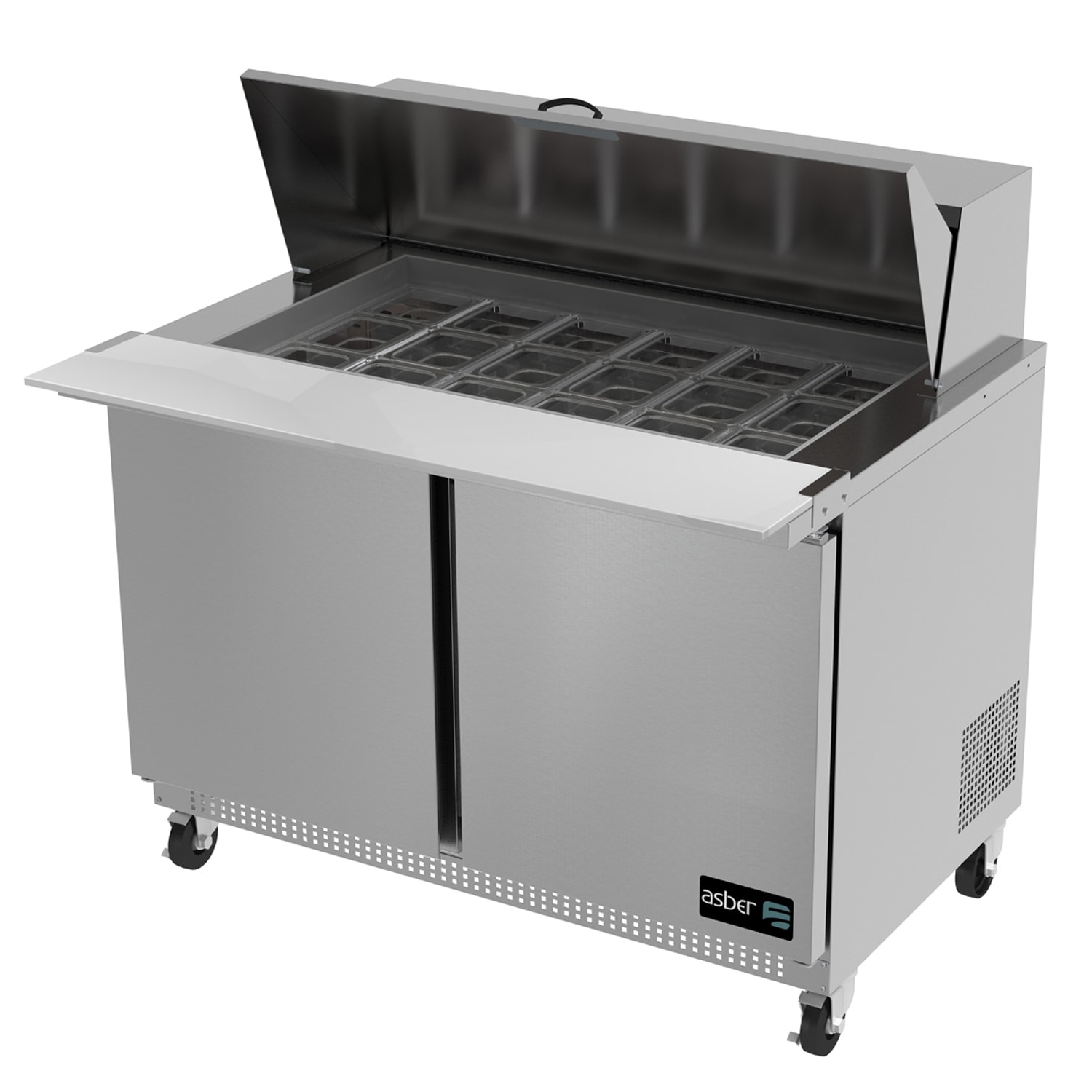 This Preparation Counter from Darling Foodservice features an all stainless steel interior and exterior construction for a cleaner and safer food environment. The Electro‐mechanic controller to keep food quality for longer periods of time. Designed for forced air underneath pans to keep products fresher and maintain products at 32° F to 41° F temperature in food pans and 32° F to 46° F in cabinet interior. The stainless steel tray/shelf separates the bottom of food pans from the inside of the cabinet so food does not fall inside the cabinet, making it easier to keep clean. This unit complies with NSF7 standards for food product safety.