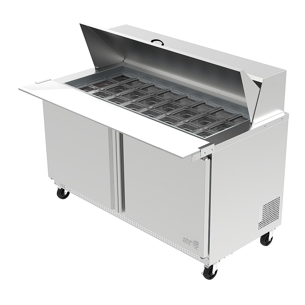 This salad or sandwich prep table is designed for forced air underneath pans to keep products fresher and maintain products at 32° F to 41° F temperature in food pans and 32° F to 46° F in cabinet interior. The Mega top Preparation Counter from Darling Foodservice is all stainless steel interior and exterior construction for a cleaner and safer food environment. The Electro‐mechanic controller to keep food quality for longer periods of time. The stainless steel tray/shelf separates the bottom of food pans from the inside of the cabinet so food does not fall inside the cabinet, making it easier to keep clean. The American Line complies with NSF7 standards for food product safety.