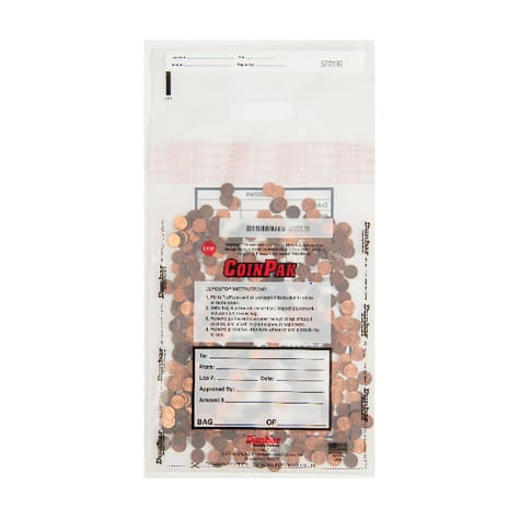 Originally designed to handle full bag shipments of coins from the Federal Reserve, these extremely durable CoinPak bags exceed the standards of OSHA, the Federal Reserve Bank and the coin processing industry. Ideal for vending companies, retailers, financial institutions and casinos, these film coin deposit bags are composed of extremely strong, 6.5 millimeter thick film and can handle coin shipments of up to 60 pounds of loose or rolled coins. The built in handle assists with lifting and transporting while the easy "press to close" closure, tear-off receipt and dual numbering make for easy use even under the most time-sensitive circumstances. The back pouch allows for the addition of deposit slips, checks and other documents.