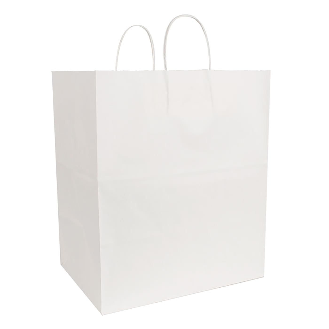 These S. Walter Packaging paper shoppers have a serrated top edge and paper twist handles. Logo or name can be imprinted.