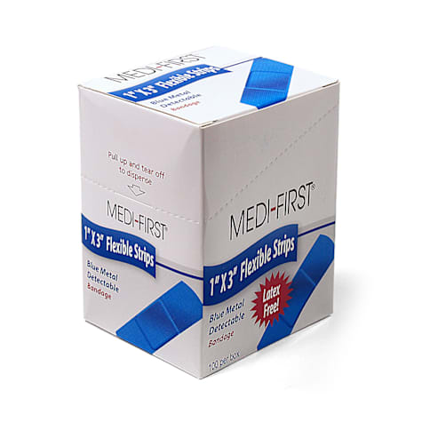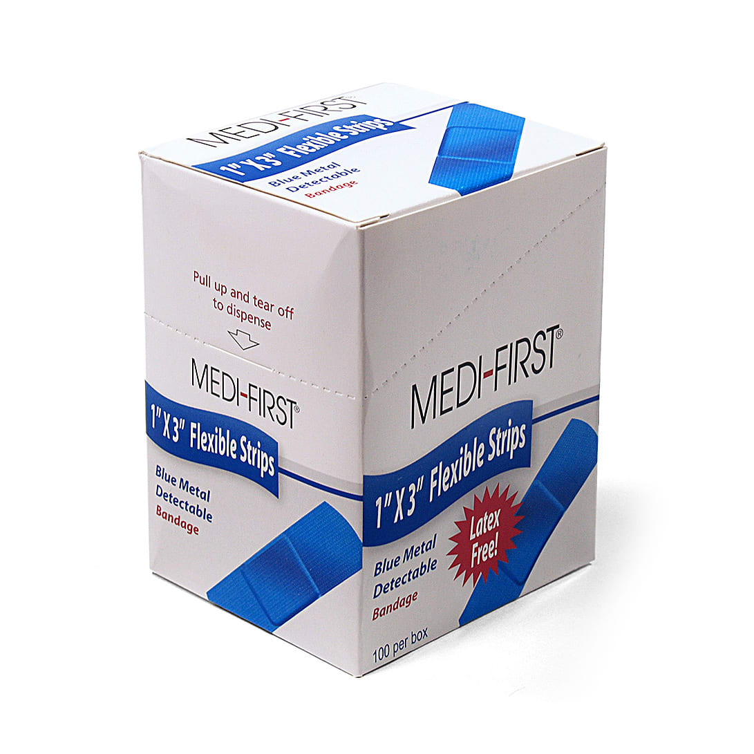 Made to protect minor cuts and scrapes to help prevent additional injury and infection, these adhesive bandages are a blue color for easy visual spotting, and contain woven metal threads that are metal‐detectable, making them the right choice for use in food handling and packaging applications.