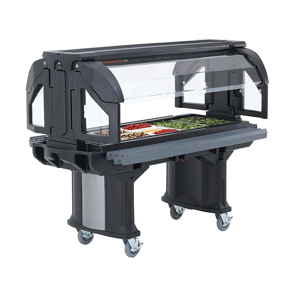 This Versa Food Bar from Cambro is perfect for offering cold Grab n' Go items such as salads, sandwiches, beverages and snacks. This non-electric mobile vending solution includes sneeze guards to maximize safety and ergonomic molded-in handles on both ends to ensure easy maneuvering. Operators have the ultimate flexibility to customize a Versa Food Bar with a variety of optional accessories for holding, organizing, and holding cold items safely 4+ hours. Designed from durable rotomolded material that is rust, dent, and break resistant.