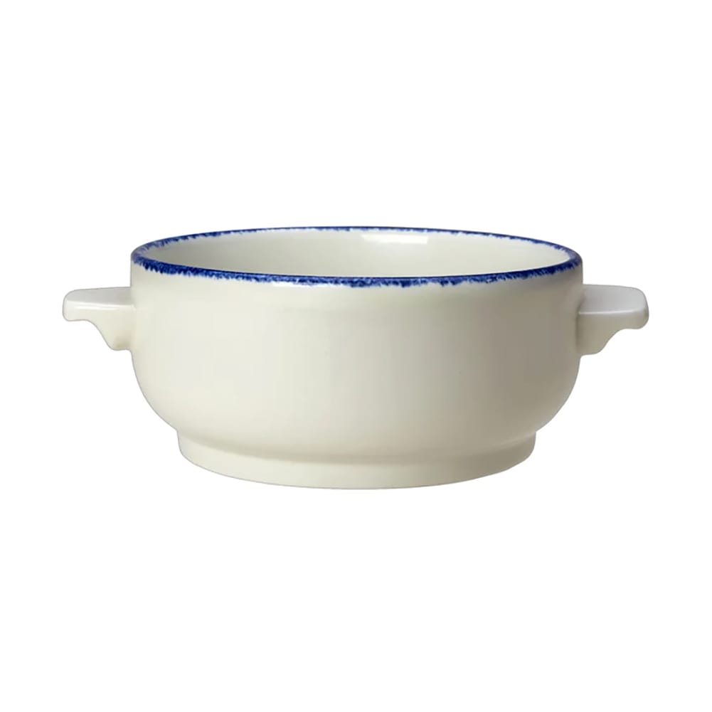 This soup bowl base from Steelite is part of the Blue Dapple Collection and features a blue color around the edge. This bowl is hand-finished with a textured reactive glaze on the edge and has exceptional resistance to mechanical and thermal shock.