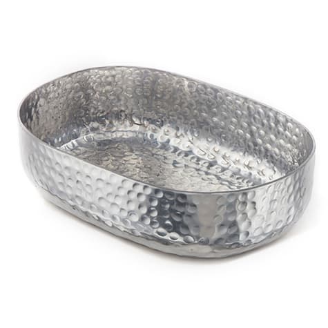 This aluminum oval basket from American Metalcraft features a silver color and is perfect for presenting all kinds of entrees and sides. Your customers will love the artisanal aesthetic created by the individually hammered design.