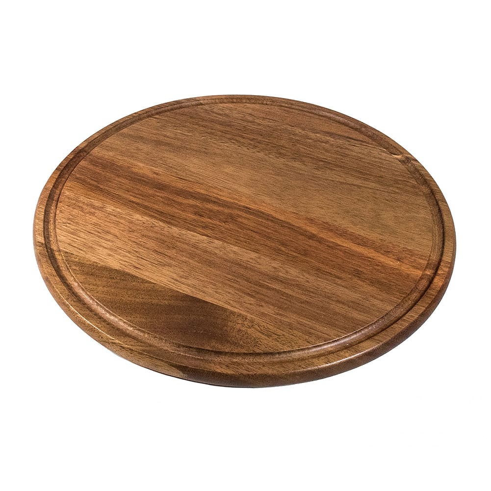 This 13" round board is perfect for medium pizzas, entrees and charcuterie! It's made of Acacia wood and has a juice groove around the edge.