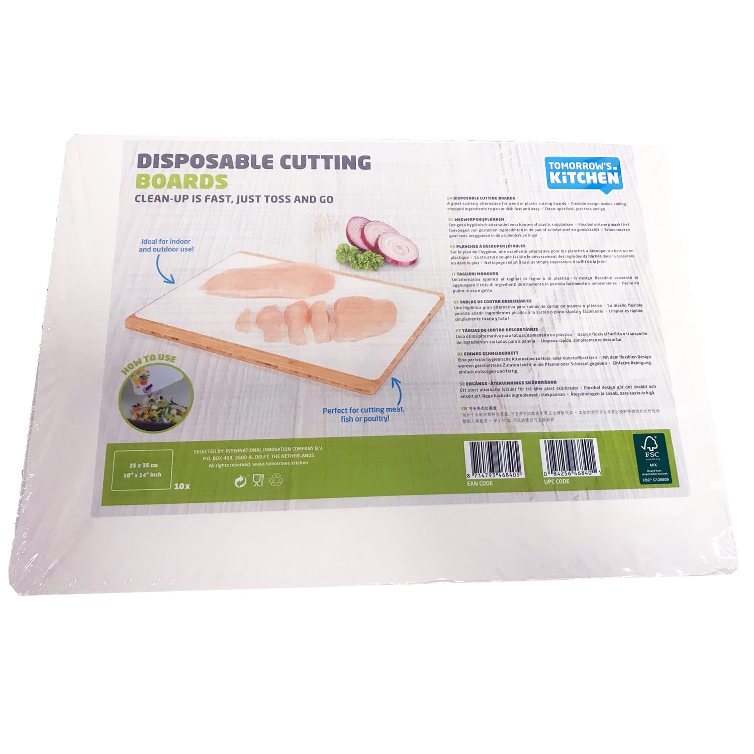 These disposable cutting boards from Tomorrow's Kitchen make clean-up quick and easy! Use directly on your countertop, these sturdy but recyclable boards stand up to any knife.