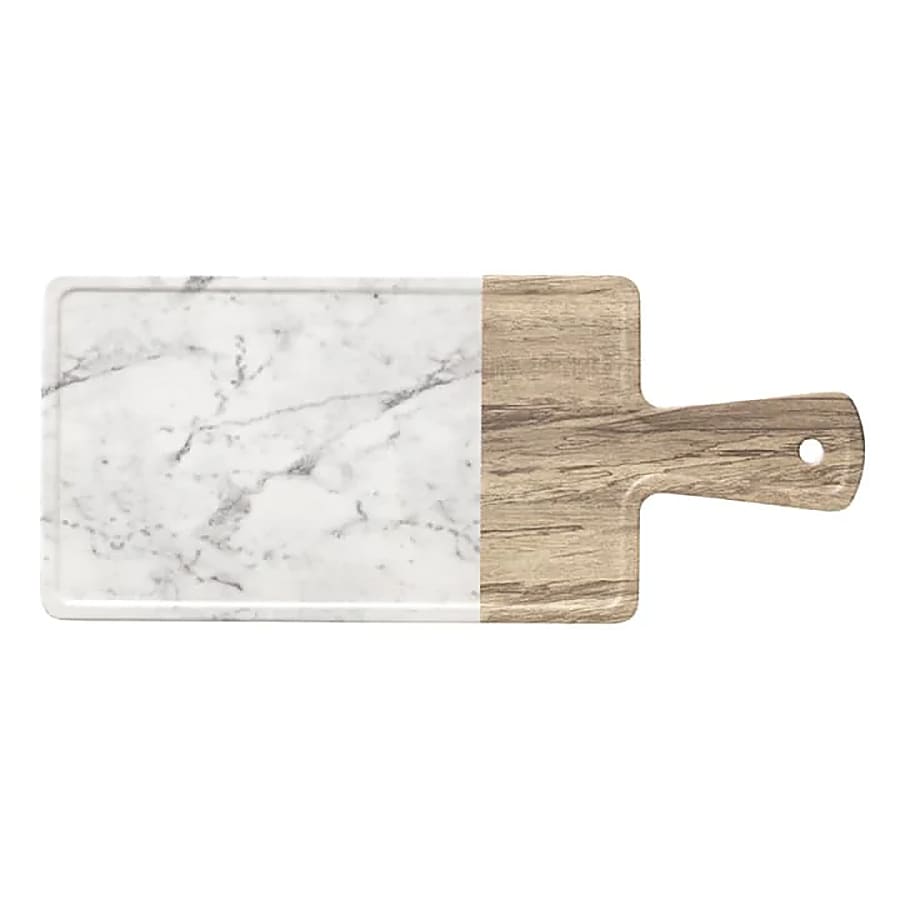 Serve breads, fruit, cheese and more on this 12" x 7" serving board from World Tableware. This serving board features the elegant look of wood and marble but is actually made from durable melamine!