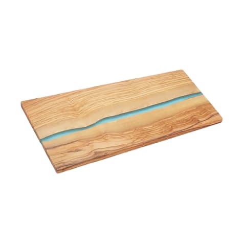 This large rectangular serving board measures 18 inches by 10 inches and features beautiful olive wood construction with a bold blue polyresin streak. Perfect for serving a variety of dishes, from hors d'oeuvres to cheese, this board's unique design adds visual interest to any presentation. Hand wash only to preserve its stunning appearance.