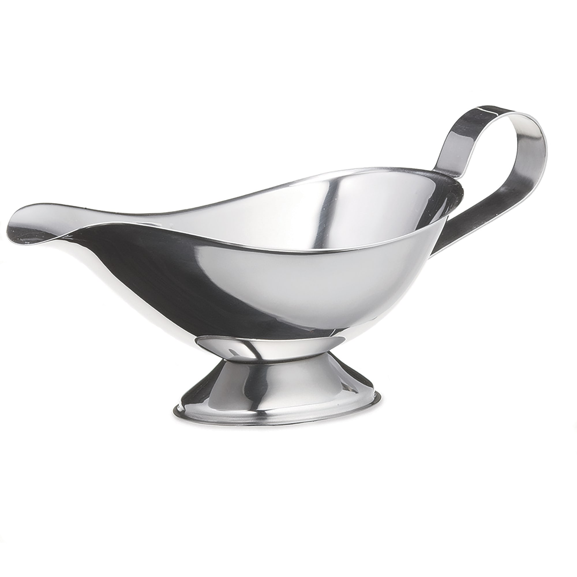 This 3 ounce stainless steel gravy boat from TableCraft is perfectly portioned for showcasing your sauces and can be easily passed around the table. It has a traditional design that's elegant.