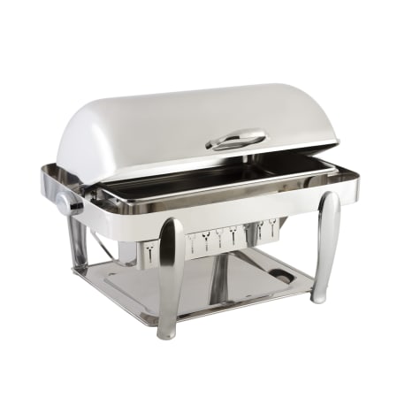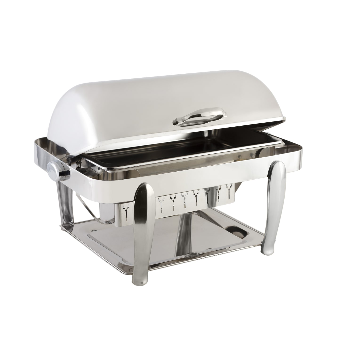 This elegant chafer works great for any occasion. The Manhattan rectangular chafer is made of stainless steel with chrome‐plated trim and legs that have smoothly curved styling of the Roman design. It also has a full roll down, vented lid.