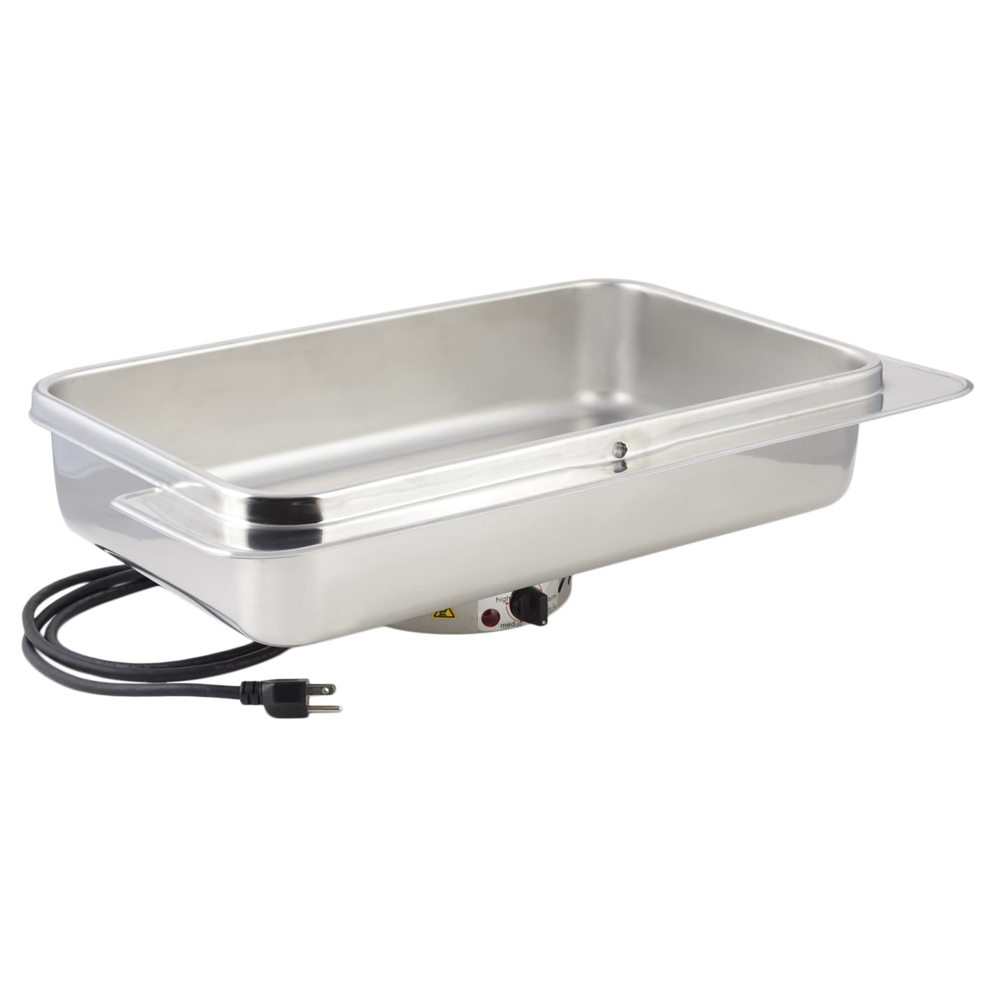 This 2 gal stainless steel dripless water pan is rectangular in shape and has an attached 600W heating stove.