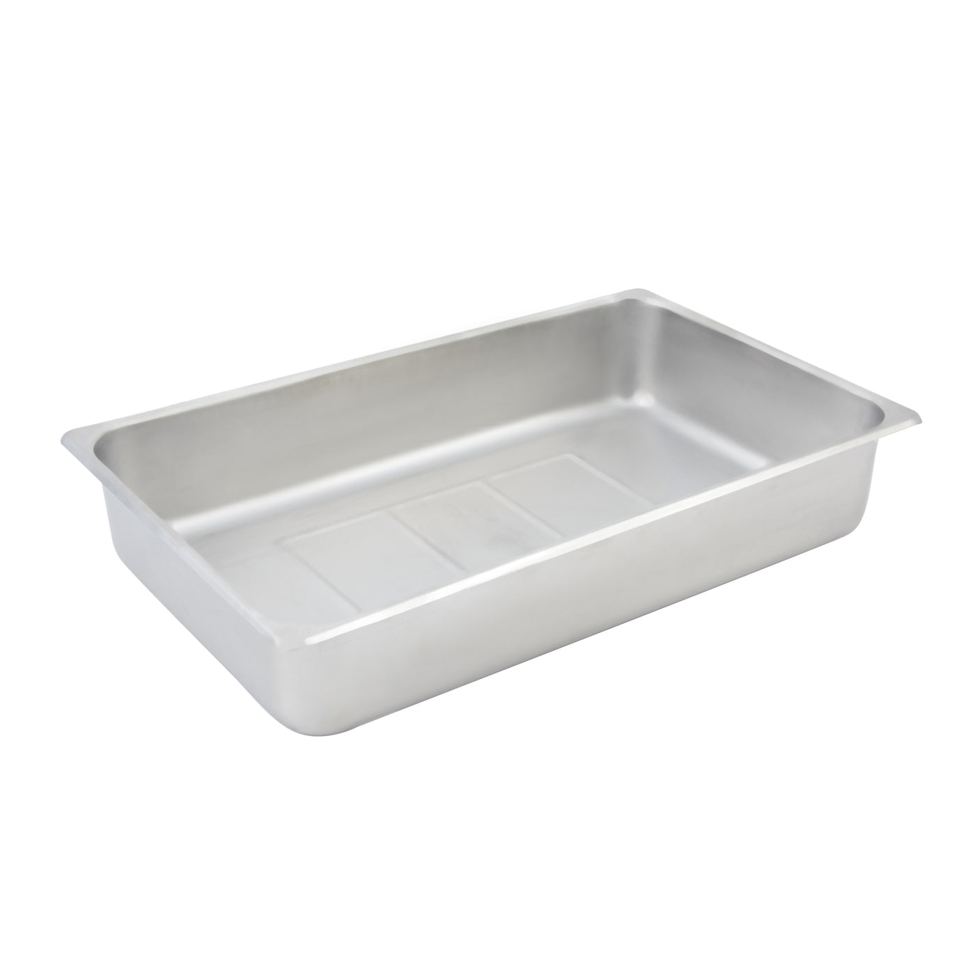 This 2 gal rectangular water pan is made of stainless steel and fits full size rectangular chafers.