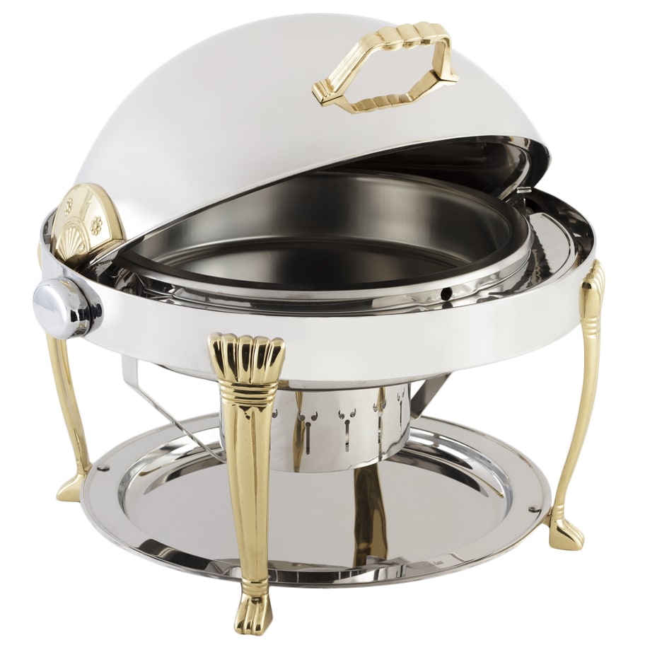 This 2 gallon round chafer is made of stainless steel with brass trim and features the vertical grooved leg styling of the Aurora design. It includes a dripless water pan and cover, and has a full roll down lid with halfway locking ability and a slow down lock mechanism.