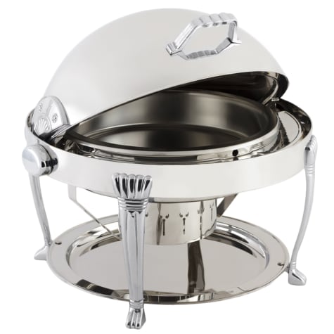 This Elite 2 gallon round chafer is made of stainless steel with chrome‐plated trim. It includes a dripless water pan and cover, and has a full roll down lid with halfway locking ability and a slow down lock mechanism. It features the vertical grooved leg styling of the Aurora design.