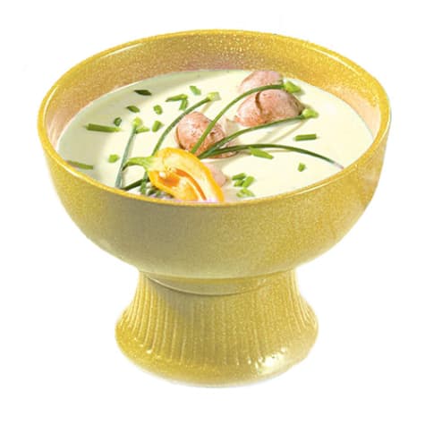 This 2 quart pedestal round soup / salad bowl from Bon Chef features a harvest gold color and will add an elegant look to any table setting. This bowl is made of durable sandstone and looks like ceramic but is durable, unbreakable and maintains consistent food temperatures. Perfect for restaurants or banquet facilities.
