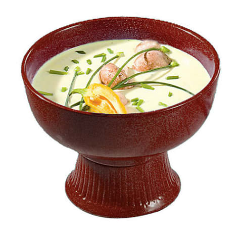 This 2 quart pedestal round soup / salad bowl from Bon Chef is made of durable sandstone and looks like ceramic but is durable, unbreakable and maintains consistent food temperatures. This bowl features a terra cotta color and will add an elegant look to any table setting. Perfect for restaurants or banquet facilities.