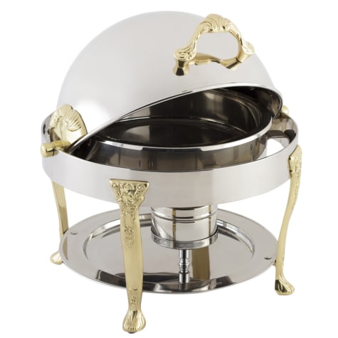 This petite round 3 Qt. chafer is made of stainless steel with brass trim and brass floral‐patterned leg styling of the renaissance design .