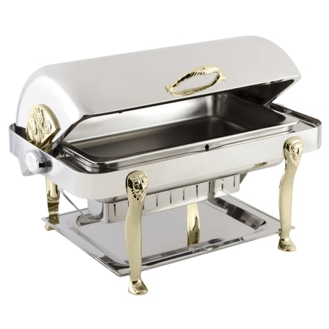 This 2 gal rectangular chafer is made of stainless steel with brass trim and features the bold lion's‐head leg styling of the Lion design. It includes a dripless water pan and cover, and has a full roll down lid with halfway locking ability and a slow down lock mechanism.