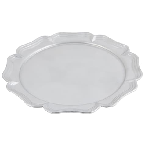 This 16" round Queen Anne platter is good for serving hot or cold foods. Great for appetizers. Made of cast aluminum with a pewter glo finish and gentle edge styling that resembles flower petals.