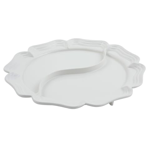 This 18" round Queen Anne platter is made of cast aluminum with a white sandstone finish and a wave‐shaped divider down the center that makes serving two dishes at once easy.
