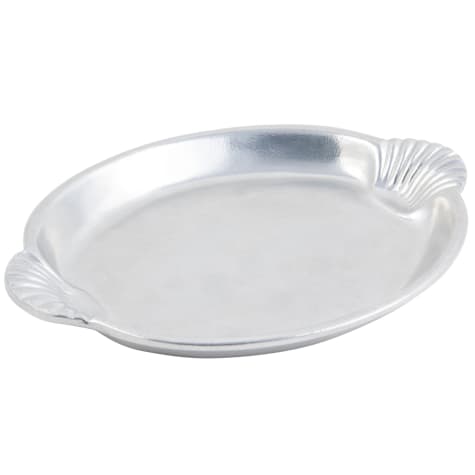 This 14" x 20" rectangular platter is made of cast aluminum with a pewter glo finish and seashell styling at the ends.