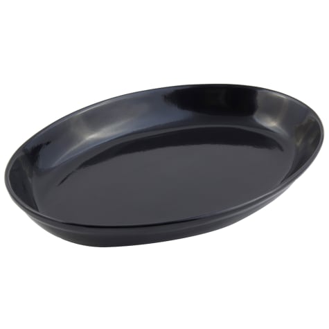 This 11" x 15" oval platter is made of cast aluminum with a black sandstone finish and has a coupe edge design.