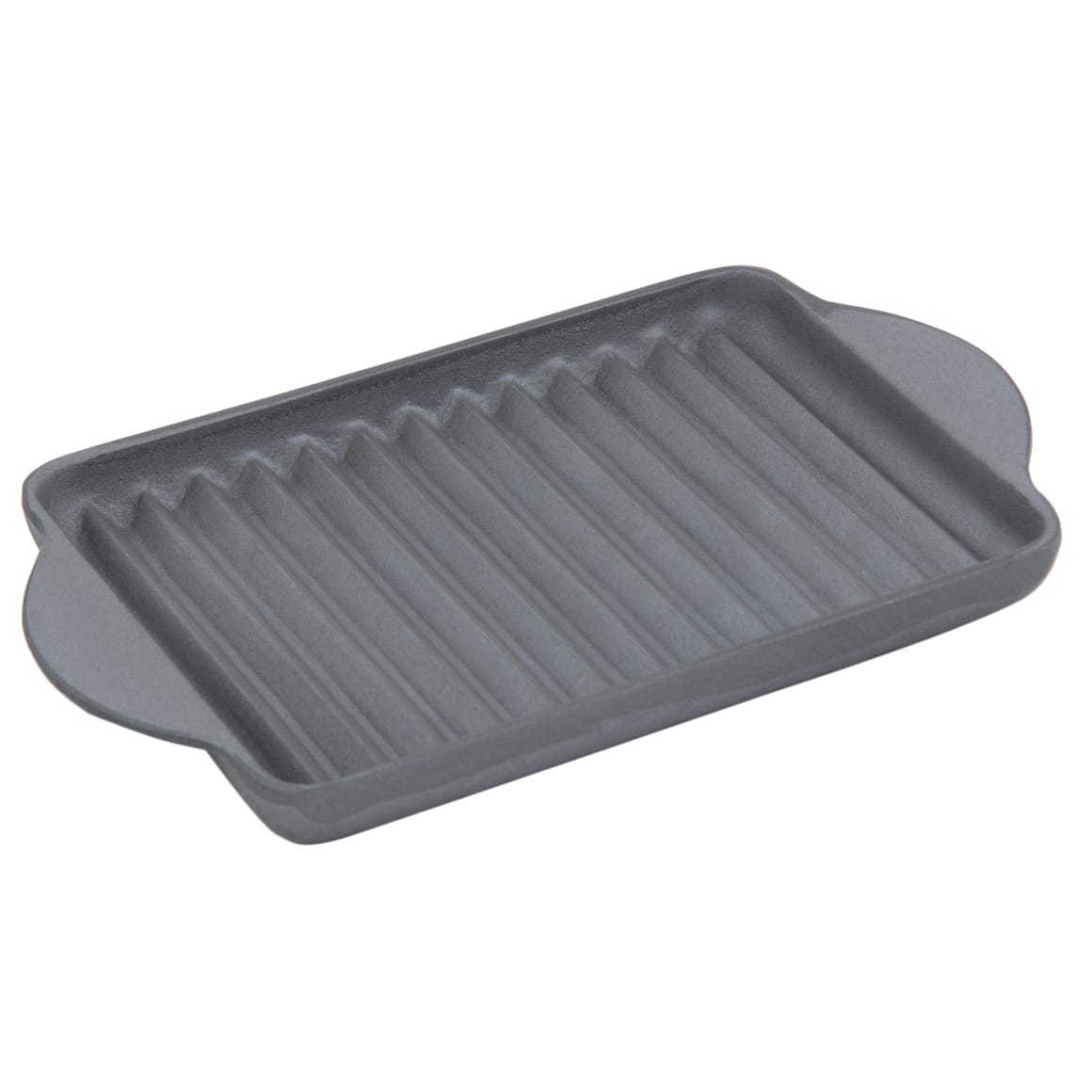 Give meats a grilled look right from the oven with this 9" x 5‐1/2" rectangular grill tray. It's made of cast aluminum with a ridged surface and a matte black Tempo finish that promotes heat transfer for maximum efficiency in high‐volume cooking.