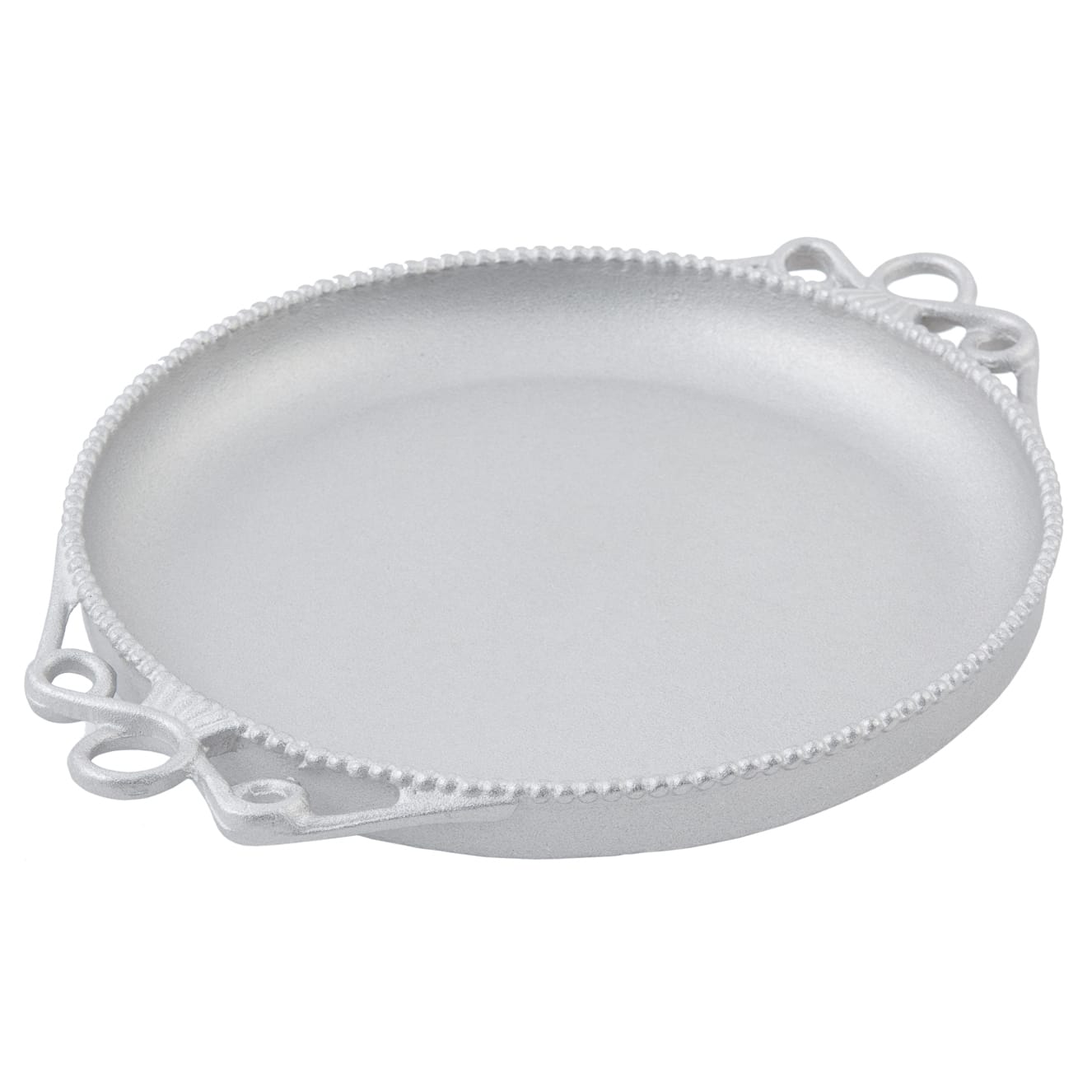 This 18" round platter is made of cast aluminum with a pewter glo finish and has the ridged edge and looped handles of the Bolero design.