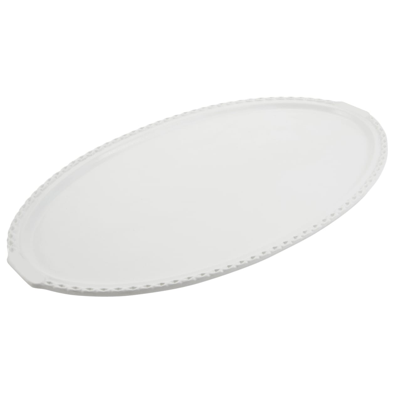 This 19" x 33" oval platter is made of cast aluminum with a white sandstone finish and a woven‐style design around the rim.