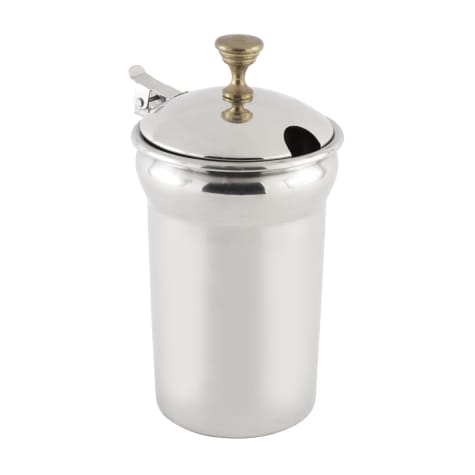 This 1.5 Qt. gravy warmer is made of stainless steel with brass accents and includes one soup insert, one heater stand with water pan, and one fuel holder.