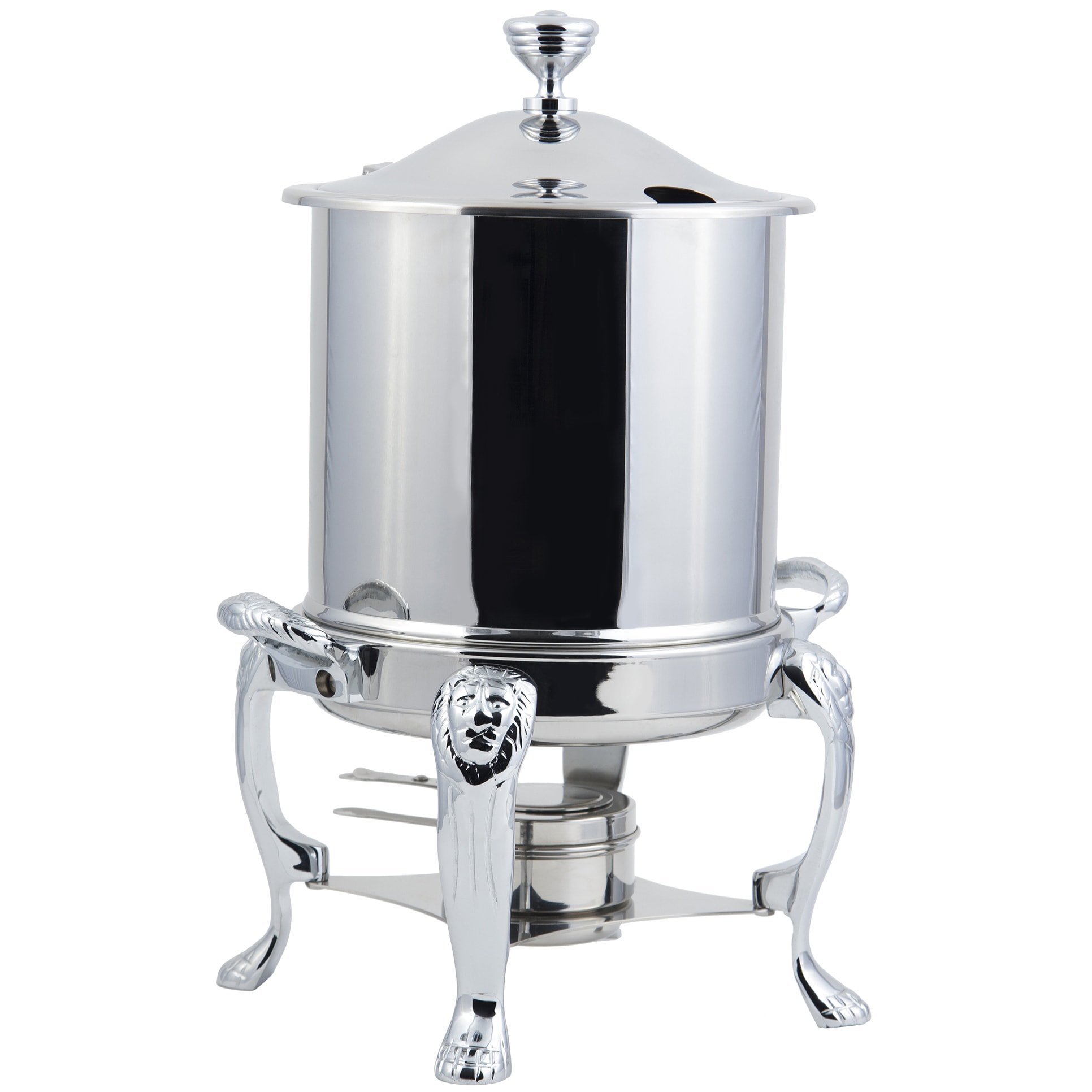 This petite marmite is made of chrome‐plated stainless steel and will hold 8 quarts of your best soups. It features the bold lion's head decorations of the Lion design and has a hinged lid.