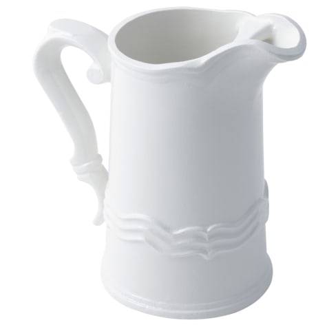 This Queen Anne water pitcher holds 2 quarts of iced water or iced tea. It's made of cast aluminum with a white sandstone finish that looks just like china, but has far better durability.