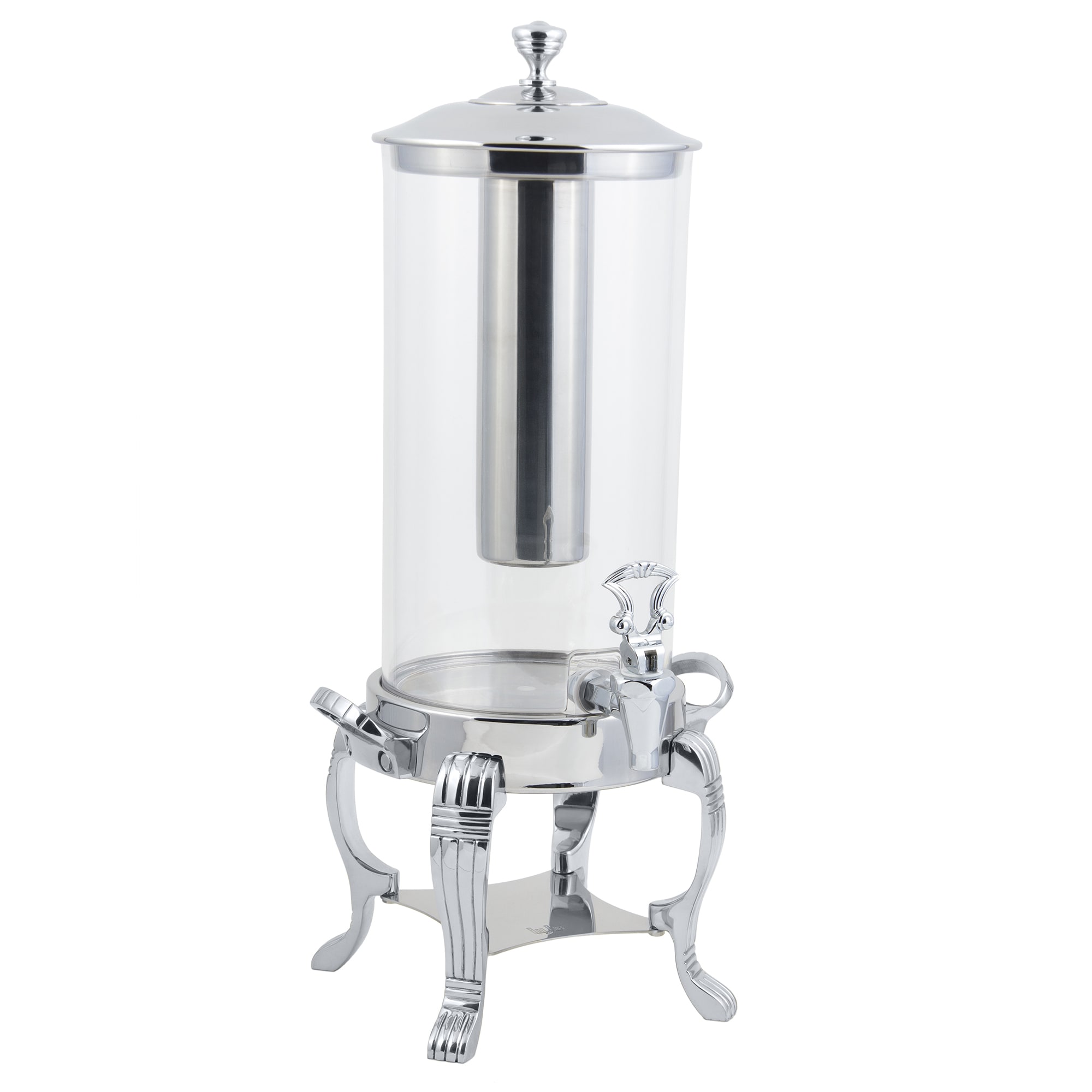 This stainless steel 2 gal juice dispenser has a chrome‐plated finish with a clear body. It features the vertical grooved decorations of the Aurora design. It includes a stainless steel ice insert.