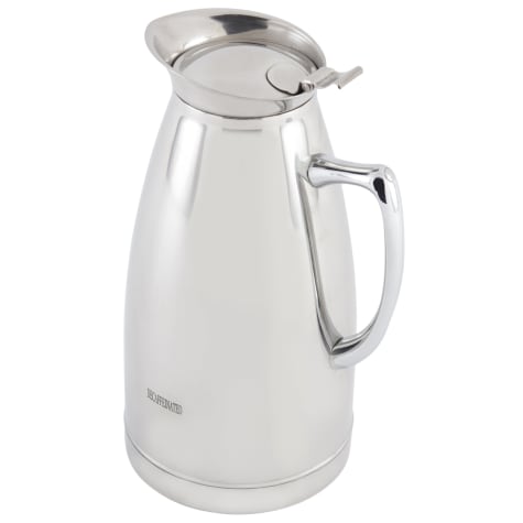 This 1.5 Qt. insulated coffee server with hinged lid is made of satin finish stainless steel and has a "decaffeinated" label imprinted on the side.
